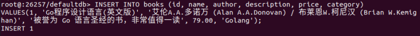INSERT INTO books (id, name, author, description, price, category) VALUES(1, 'Go程序设计语言(英文版)', '艾伦A.A.多诺万 (Alan A.A.Donovan) / 布莱恩W.柯尼汉 (Brian W.Kemighan)', '被誉为 Go 语言圣经的书,非常值得一读', 79.00, 'Golang');