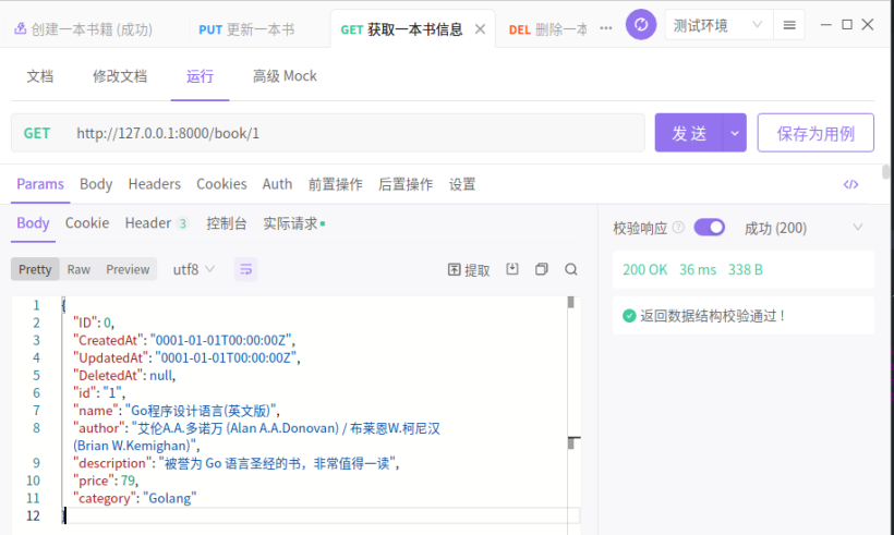 如上所示,书籍的结构体中进行简单设计包含 id(ID)、书名(Name)、作者(Author)、书籍描述(Description)、价格(Price)和类别(Category)。