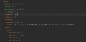 如果我们的环境由主从换成了主从+哨兵,修改配置也比较简单,先注释掉原来的host和port的配置,替换成哨兵的配置,如下图: