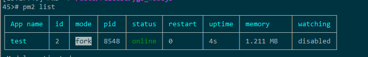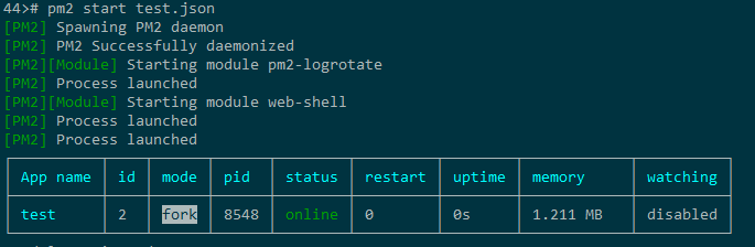 # chmod +x test.sh #添加执行权限 # pm2 start test.json #启动,如下图:# pm2 list #查看pm2进程,如下图: