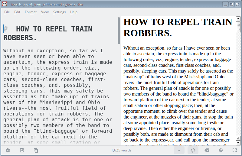 我把这篇文章保存为?how_to_repel_train_robbers.md?,它位于我的?Documents??目录下,名为?samples?的子目录中。它在 Ghostwriter 中看起来是这样的: