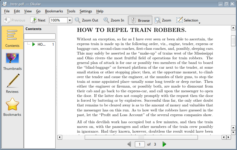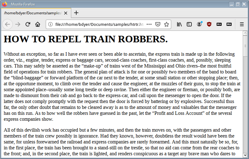 该项目的示例文档将是一篇文章,该文章于 1894 年 12 月首次发表在《北美评论》上,标题为“如何击退火车劫匪”。我将使用的 Markdown 文件是前一段时间创建的,该文章的一个恢复项目的一部分(LCTT 译注:这是篇一百多年前发表的文章,这是一个数字化“恢复”项目)。