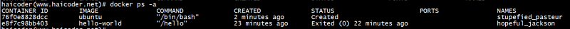 haicoder(www.haicoder.net)# docker create ubuntu #返回报文 76f0e8828dcc4dd060819435039adcfbe66f26726ddc9ea58035d0c46420eaaa