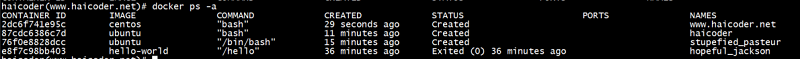 haicoder(www.haicoder.net)# docker create -it --name haicoder ubuntu bash #返回结果 87cdc6386c7d92e3bb2b71f1c50369652ec6809c26aa388de5ef8b29165ff781