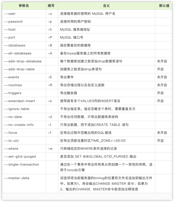 执行 mysqldump --help 或参考 MySQL 官方文档,我们发现 mysqldump 工具可配置的参数有很多,以下简要说明部分常用的参数。