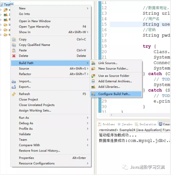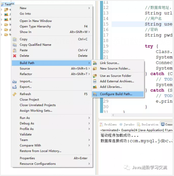 - 首先导入拓展包“mysql-connector-java-5.1.7-bin.jar”,在Ecilpse编辑软件的当前项目右键选择“Bulid Path”,再选择“Configure Build Path...”,选择Libraies,在右边有个“Add External JARs...”按钮把这个拓展包加进来,然后点击“OK”。具体操作如下图所示: