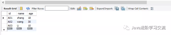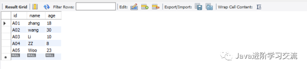 System.out.println("id:"+rs.getString("id")+" name:"+rs.getString("name")+" age:"+rs.getInt("age"));