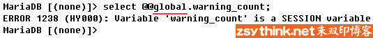 但是,我们不能在指明要查看全局变量时,却指定会话级别独有的变量,比如上例中的warning_count变量只存在于会话级别,但是我们偏偏却要使用如下方法查看,则会报错。