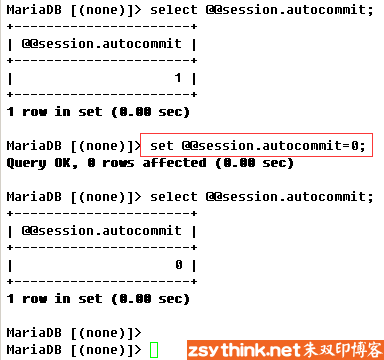 会话级别中autocommit变量的值为1,我们现在将会话级别中的autocommit变量的值改为0
