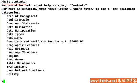我们也可以通过分类查看帮助,那mysql将帮助分为了哪几类呢,使用help contents命令进行查看。