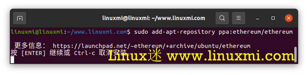 linuxmi@linuxmi:~/www.linuxmi.com$ sudo add-apt-repository ppa:ethereum/ethereum