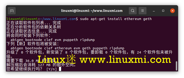 linuxmi@linuxmi:~/www.linuxmi.com$ sudo apt-get install ethereum geth