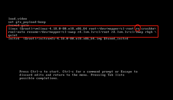 按’e’键,进入如下界面,移动向下方向键至“linux16”开头的行。然后按向右的方向键移动,找到“ro”并将其修改为“rw init=/sysroot/bin/bash”。(rw后边有空格,\是系统自己添加的)