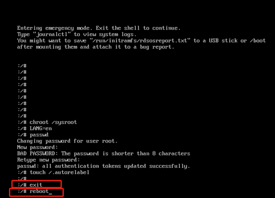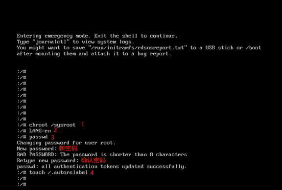 /# chroot /sysroot/ /# LANG=en (把语言改为英文) /# passwd /# touch /.autorelabel