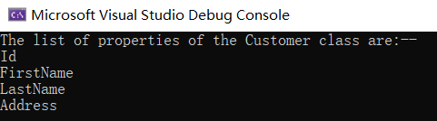 Console.WriteLine("The list of properties of the Customer class are:--");