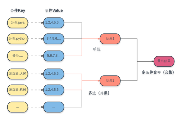 这里每个条件都事先将计算好的结果集 ID 存入对应的 Key 中,选用的数据结构是集合(Set)。