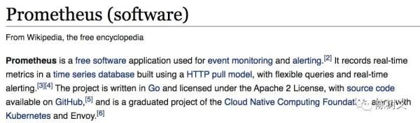 Prometheus(普罗米修斯)是古希腊的一个神明,名字的意思是「先见之明」。从它的名字可以看出,Prometheus 是做「先见之明」的监控告警用途。维基百科简单写了它的作用:Prometheus is a free software application used for event monitoring and alerting(Prometheus 是用来监控、报警的免费软件)。