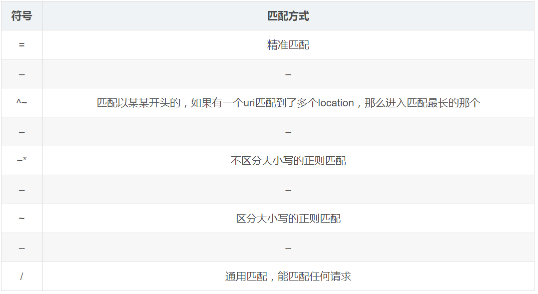 语法规则: location [=||*|^~] /uri/ {… }首先匹配 =,其次匹配^~,其次是按文件中顺序的正则匹配,最后是交给 /通用匹配。当有匹配成功时候,停止匹配,按当前匹配规则处理请求。