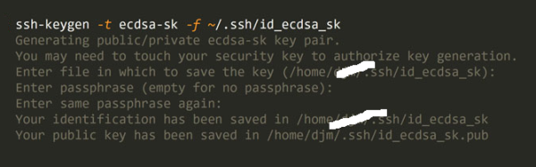 ssh-keygen将生成两个文件,一个称为id_ecdsa _sk,私钥,一个称为id_ecdsa _sk.pub公钥。只需要将该公钥添加到服务器上的authorized_keys即可中。