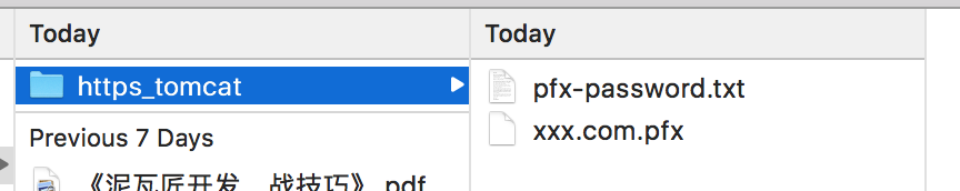在证书控制台下载Tomcat版本证书,下载到本地的是一个压缩文件,解压后里面包含.pfx文件是证书文件,pfx_password.txt是证书文件的密码。