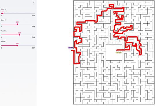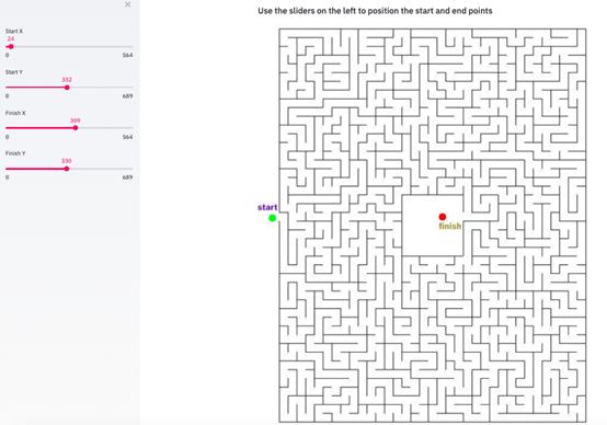 现在,我希望将此程序变成一个单页Web应用程序,用户可以在其中上传迷宫图像(或使用默认迷宫图像),调整迷宫的开始和结束位置,并查看最终解决的迷宫。