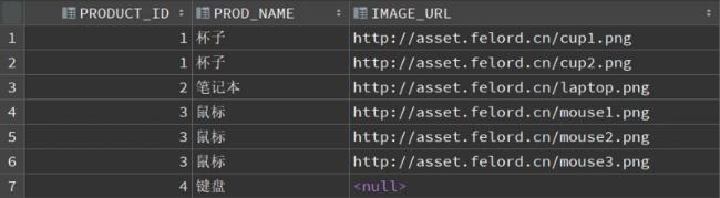 然后我分别写入了一些商品和这些商品对应的图片,通过下面的左连接查询可以看出它们之间具有明显的一对多关系: