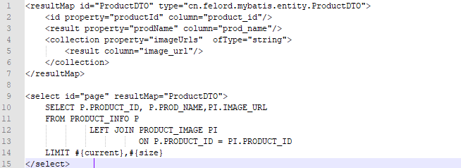 2020-06-21 23:35:54.515 DEBUG 10980 --- [main] c.f.m.mappers.ProductInfoMapper.page : ==> Preparing: SELECT P.PRODUCT_ID, P.PROD_NAME,PI.IMAGE_URL FROM PRODUCT_INFO P LEFT JOIN PRODUCT_IMAGE PI ON P.PRODUCT_ID = PI.PRODUCT_ID limit ?,?