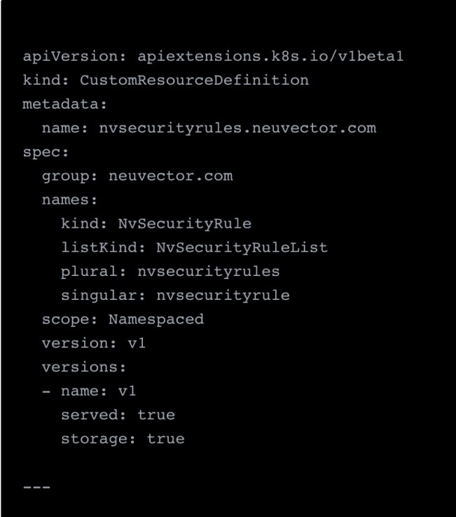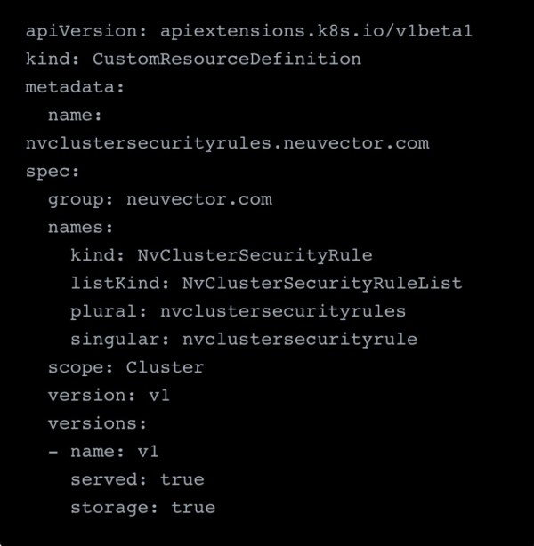 首先,您需要创建一个NeuVector CRD。如下图所示,我们使用YAML代码创建了一个CRD。同时,我们为NvSecurityRule定义了一个namespaced域,并将NvClusterSecurityRule的域范围定义为能够跨集群进行操作