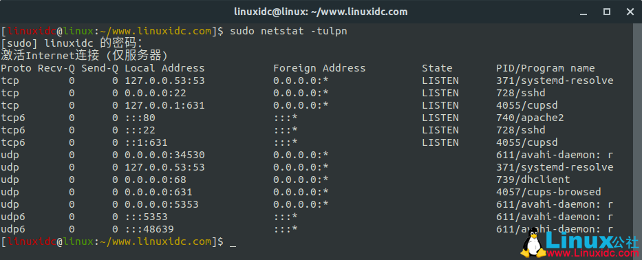 从以上命令的输出中,“State”列显示端口是否处于侦听状态(LISTEN)。