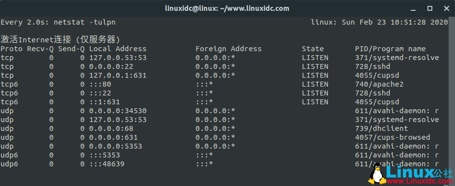 但是,要实时监视TCP和UDP端口,可以使用所示的watch实用程序运行netstat或ss工具。