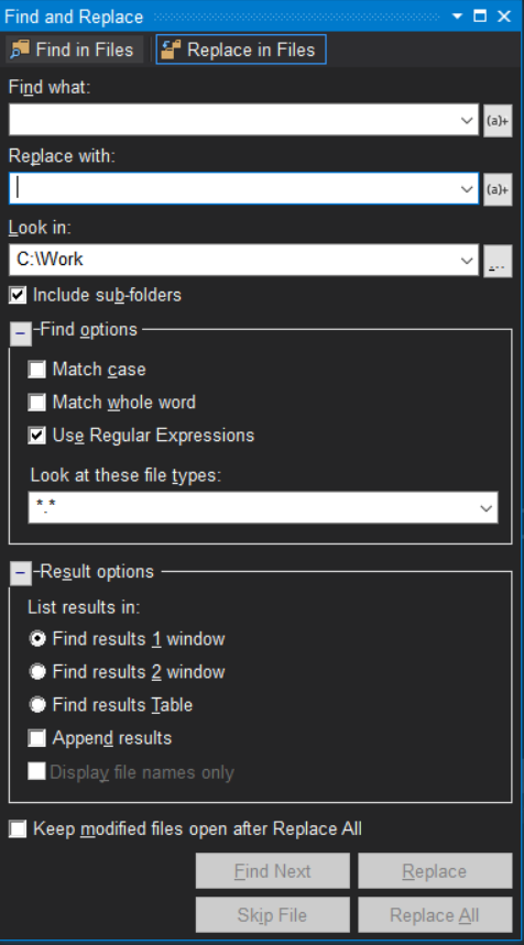 Find What: 填写查找语句的地方,可以是入任何查找关键字,也可以是正则表达式。