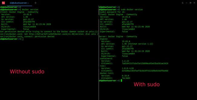 Client: Docker Engine - Community Version: 19.03.8 API version: 1.40 Go version: go1.12.17 Git commit: afacb8b7f0 Built: Wed Mar 11 01:25:46 2020 OS/Arch: linux/amd64 Experimental: false Got permission denied while trying to connect to the Docker daemon socket at unix:///var/run/docker.sock: Get http://%2Fvar%2Frun%2Fdocker.sock/v1.40/version: dial unix /var/run/docker.sock: connect: permission denied