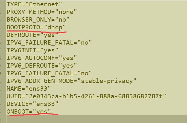 TYPE="Ethernet" PROXY_METHOD="none" BROWSER_ONLY="no" BOOTPROTO="static" (修改为静态ip) DEFROUTE="yes" IPV4_FAILURE_FATAL="no" IPV6INIT="yes" IPV6_AUTOCONF="yes" IPV6_DEFROUTE="yes" IPV6_FAILURE_FATAL="no" IPV6_ADDR_GEN_MODE="stable-privacy" NAME="ens33" UUID="2e0343ca-b1b5-4261-888a-68858682787f" DEVICE="ens33" ONBOOT="yes" (系统启动连接) IPADDR="192.168.136.131" (dhclient动态获取的ip地址) NETMASK="255.255.255.0" (打开虚拟机网络配置查看) GATEWAY="192.168.136.2"(打开虚拟机网络配置查看) DNS1="114.114.114.114"(自己找)