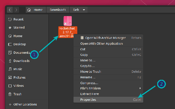 步骤 1:右键单击下载的 .deb 文件,然后选择属性: