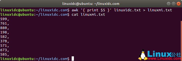 linuxidc@Ubuntu:~/linuxidc.com$ awk '{ print $5 }' linuxidc.txt > linuxmi.txt
