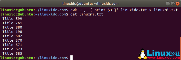 linuxidc@ubuntu:~/linuxidc.com$ awk -F, '{ print $3 }' linuxidc.txt > linuxmi.txt