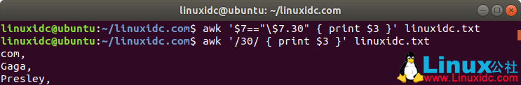 linuxidc@ubuntu:~/linuxidc.com$ awk '$7=="\$7.30" { print $3 }' linuxidc.txt