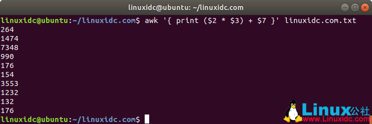 linuxidc@ubuntu:~/linuxidc.com$ awk '{ print ($2 * $3) + $7 }' linuxidc.com.txt
