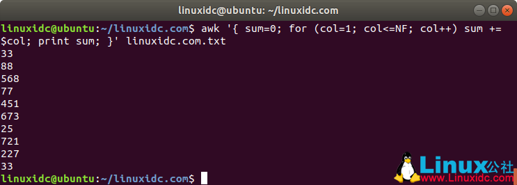 linuxidc@ubuntu:~/linuxidc.com$ awk '{ sum=0; for (col=1; col<=nf; col++)="" sum="" +="$col;" print="" sum;="" }'="">=nf;>