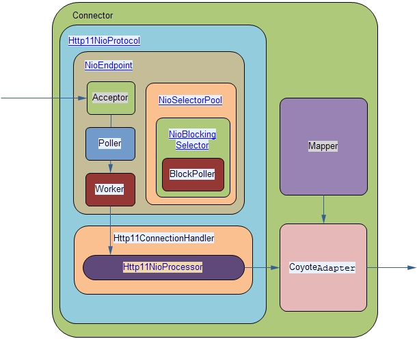 在BIO实现的Connector中,处理请求的主要实体是JIoEndpoint对象。JIoEndpoint维护了Acceptor和Worker:Acceptor接收socket,然后从Worker线程池中找出空闲的线程处理socket,如果worker线程池没有空闲线程,则Acceptor将阻塞。其中Worker是Tomcat自带的线程池,如果通过<Executor>配置了其他线程池,原理与Worker类似。