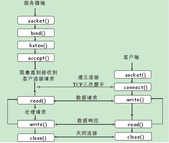 如图,这是一个完整的TCP服务器——客户端的运行流程图,其实我个人认为程序啊,不管哪个语言都是一样,核心就在于算法的设计和函数的调用。那么图中的函数都是什么意思呢?