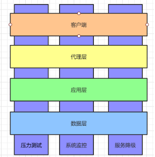 把上面7个方面的描述总结为四横三纵。按照用户请求从外到内,从上到下的方向分别是:客户端、代理层、应用层、数据层。压力测试、监控系统、服务降级作为高可用的保障贯穿四层之中形成三纵。