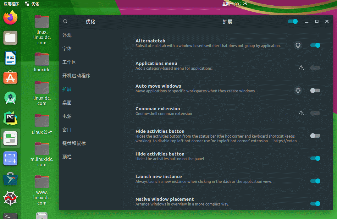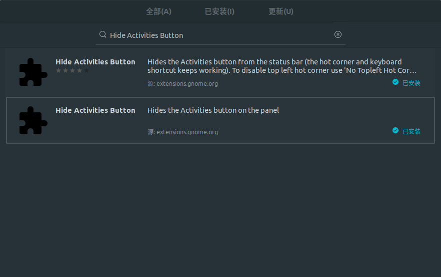 左上角的“活动”按钮显示所有打开的应用程序窗口,顶部带有搜索框,右侧是工作区。 一些用户发现它无用,并希望删除该按钮。 并且可以通过Gnome Shell扩展轻松完成。