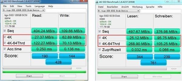 左图为不带缓存固态硬盘性能表现,右图为带有缓存的固态硬盘性能表现,我们可以可以看到,整体差别还是非常大的。