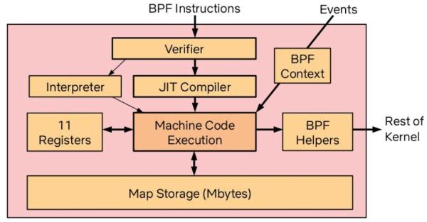 在这个背景下,eBPF 应运而生,eBPF 引入了 JIT 和寄存器,将 BPF 的功能进一步扩充,这背后的意义是,我们在内核中有一个安全的、高性能的、基于事件的、支持 JIT 的字节码的虚拟机!这其实极大地降低了拓展内核能力的门槛,我们可以不用担心在驱动中写个异常把内核搞崩,我们也可以将给 llvm 用的 clang 直接编译成 eBPF 对象,社区还有类似 bcc 这样的基于 Python 的实用工具集……