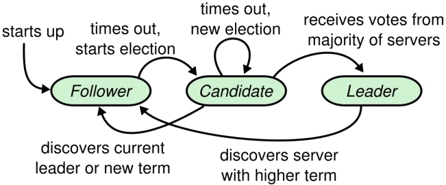 Raft算法将Server划分为3种状态,或者也可以称作角色: