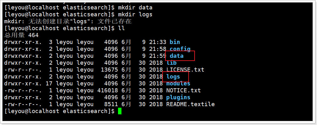 我们把data和logs目录修改指向了elasticsearch的安装目录。但是这两个目录并不存在,因此我们需要创建出来。