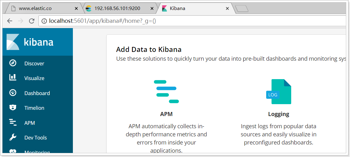 因为Kibana依赖于node,我们的虚拟机没有安装node,而window中安装过。所以我们选择在window下使用kibana。