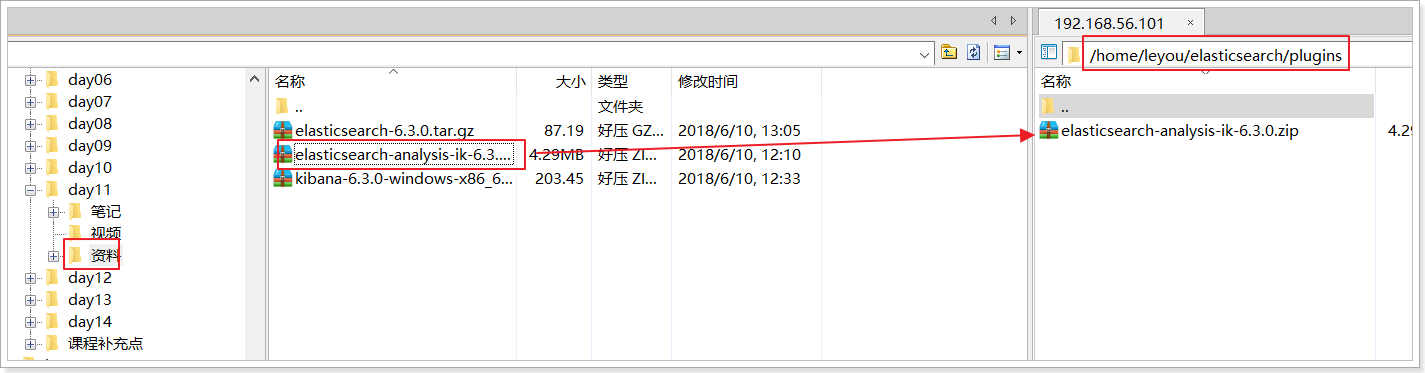 上传资料中的zip包,解压到Elasticsearch目录的plugins目录中: