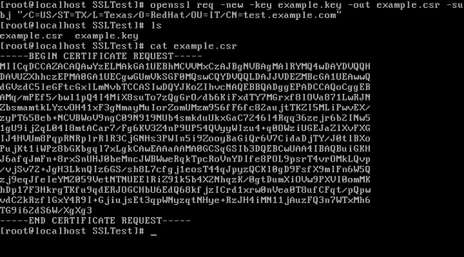 openssl req -new -key example.key -out example.csr -subj "/C=US/ST=TX/L=Dallas/O=Red Hat/OU=IT/CN=test.example.com"